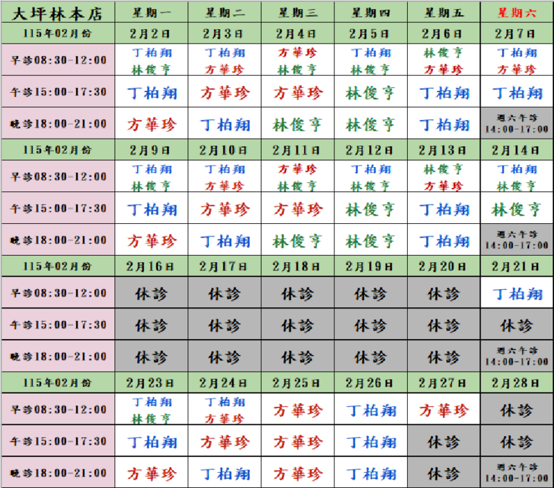 【本店門診表每月會更新請往下查看】