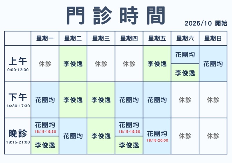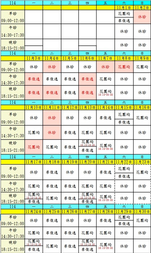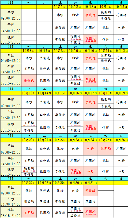 10月起門診表
