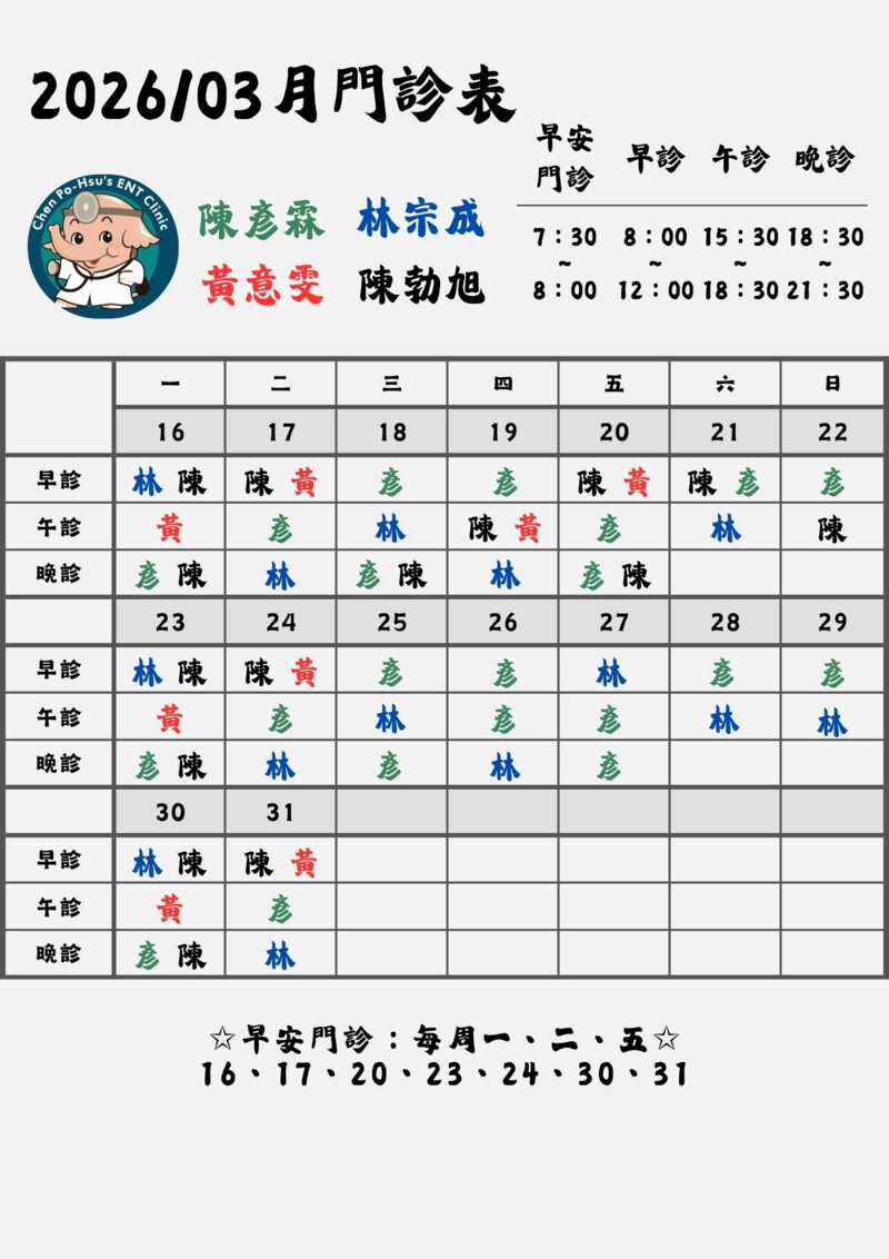 每週一、二、五 門診時間提早至7:30開診