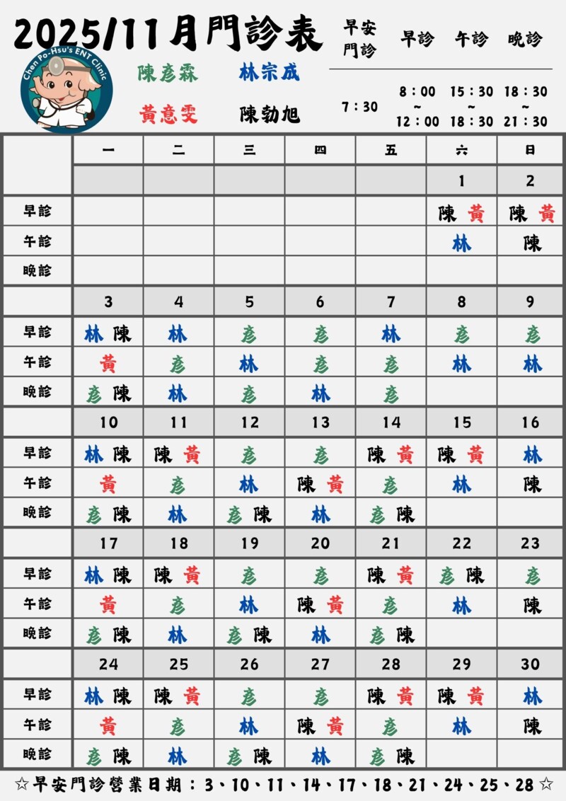 12/10~12/12(早診) 陳勃旭醫師、黃意雯醫師 請假