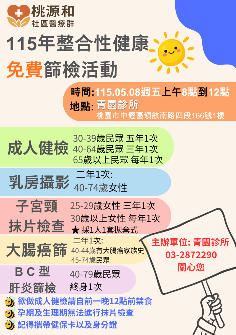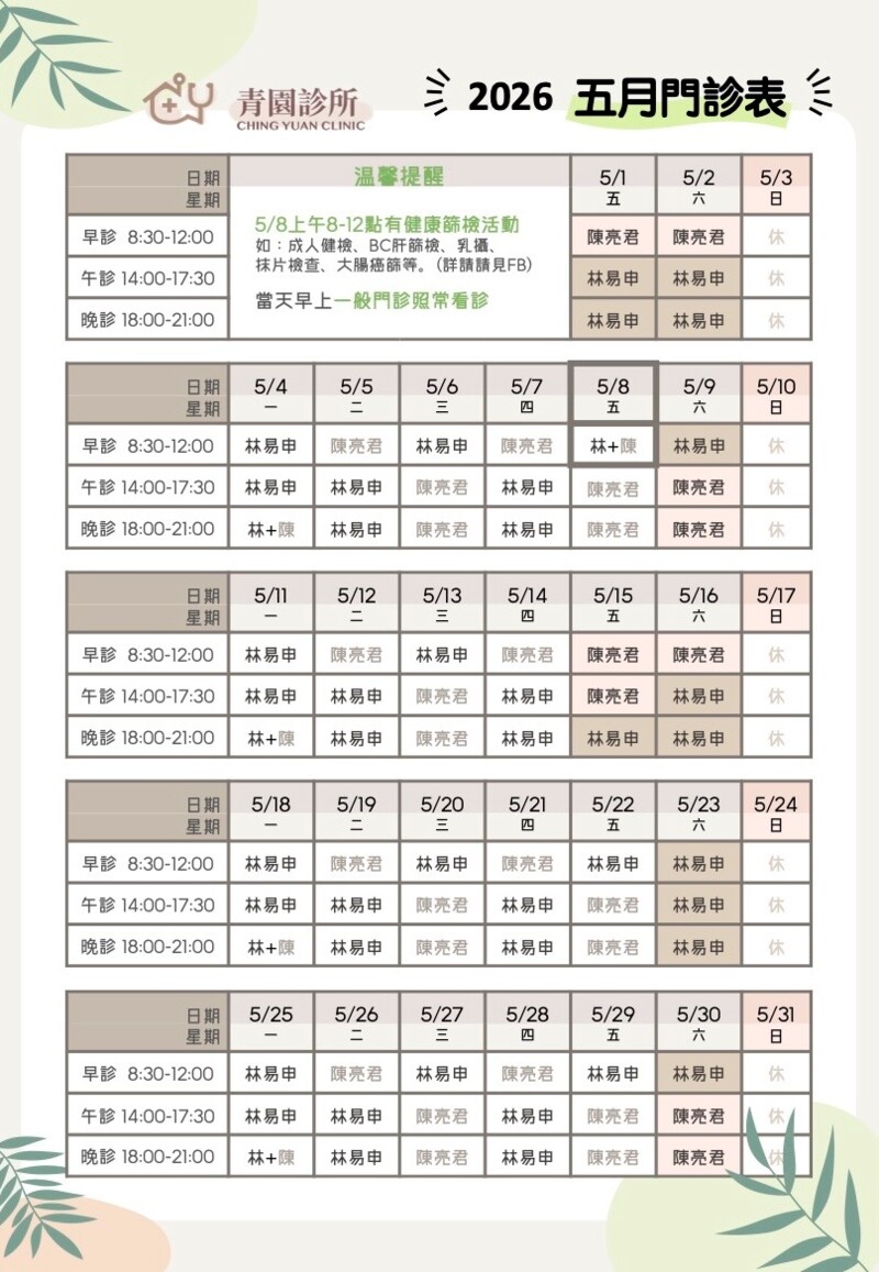 05/08 (五) 因社區篩檢活動,門診提早至0800開始