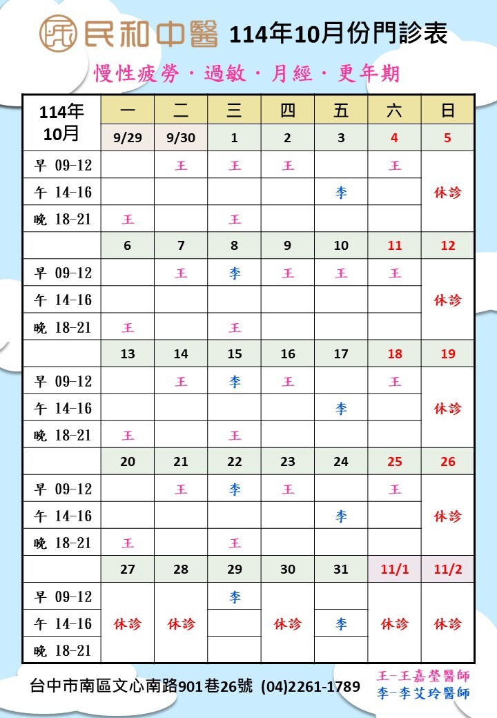 📣10/1(三)早診由王嘉瑩院長看診 📣10/6(一)中秋節照常看診 📣10/10(五)雙十節原午診李艾玲醫師改為早診王嘉瑩院長看診 📣10/27(一)~11/1(六)王嘉瑩院長休診 📣10/29(三)、10/31(五)李艾玲醫師正常看診