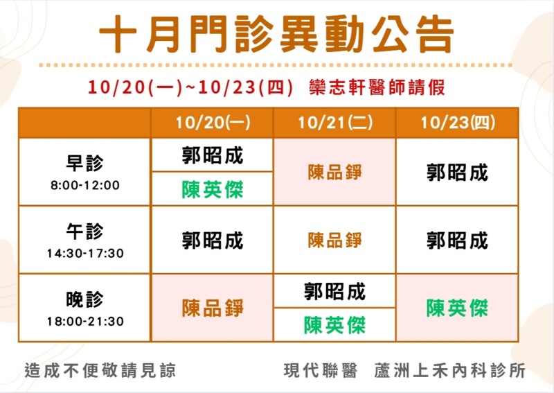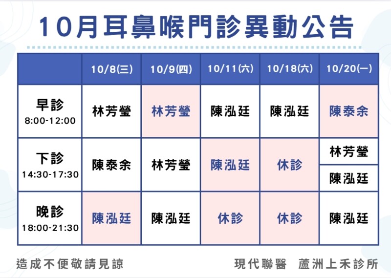 耳鼻喉科門診表 ( 週日有門診服務 )