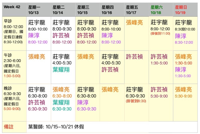 星期一到星期五 早診 8:00-12:00 午診2:30-6:00pm 晚診 6:30-9:30pm