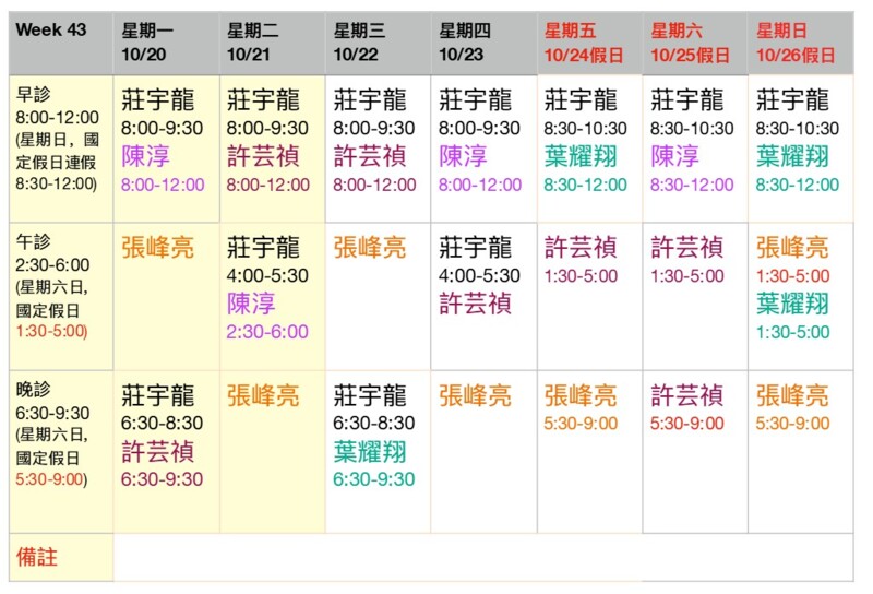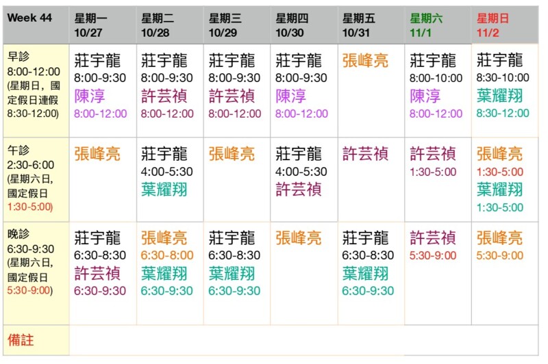 即日起,星期六及星期日,及國定假日午診改為1:30-5:00,晚診改為5:30-9:00