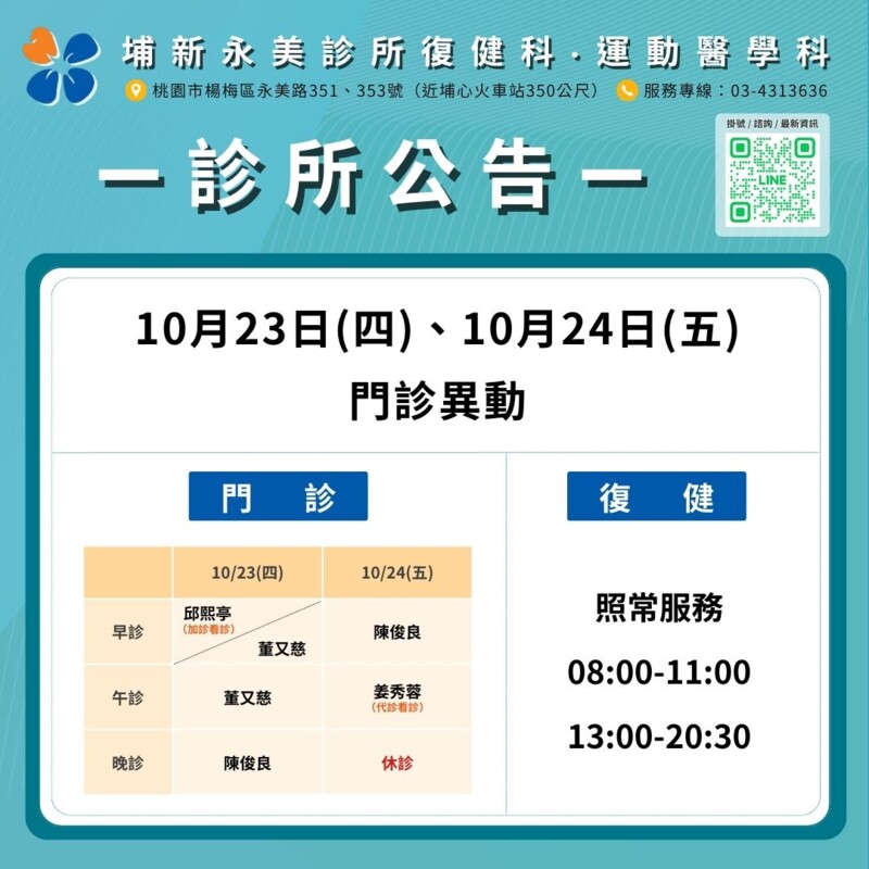 ‧ 10/24(五):午診 - 姜秀蓉醫師代診;晚診 - 休診