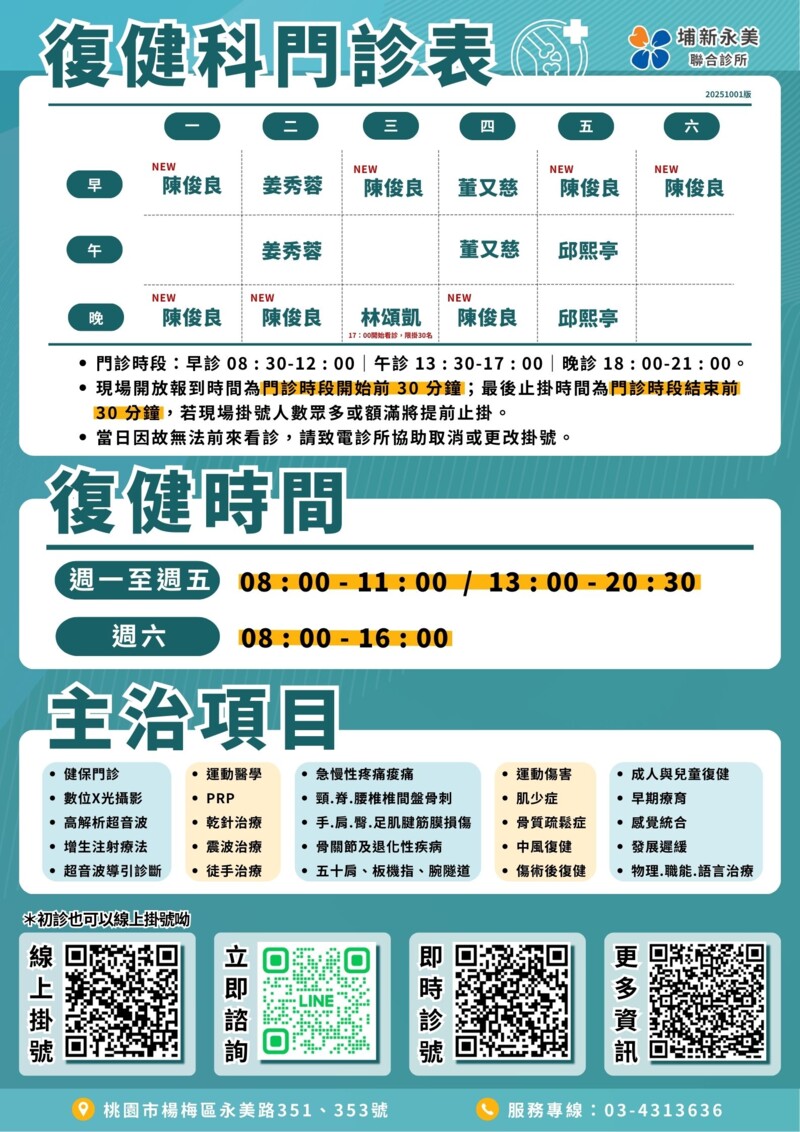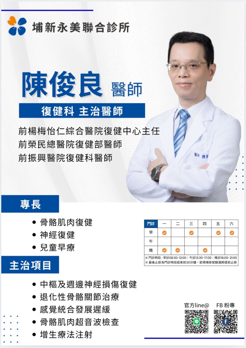 ‧ 本所復健科榮聘 陳俊良醫師 於本院駐診服務,10月起門診表異動時段如下,歡迎可多加利用線上預約掛號。