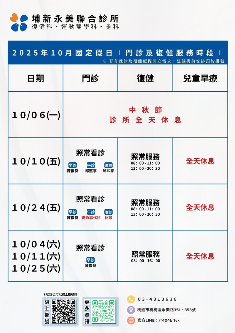 ‧ 10/24(五)、10/25(六):光復節連假,門診及復健照常服務,兒童早療休息。
