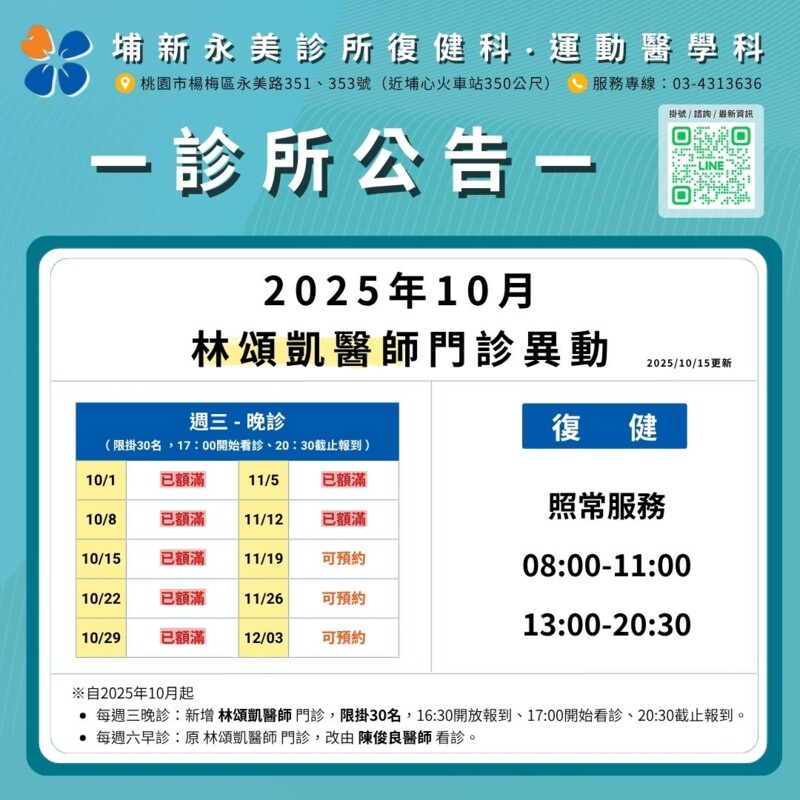 ‧ 10月起,原週六早診 林頌凱醫師 門診,改由 陳俊良醫師 看診。
