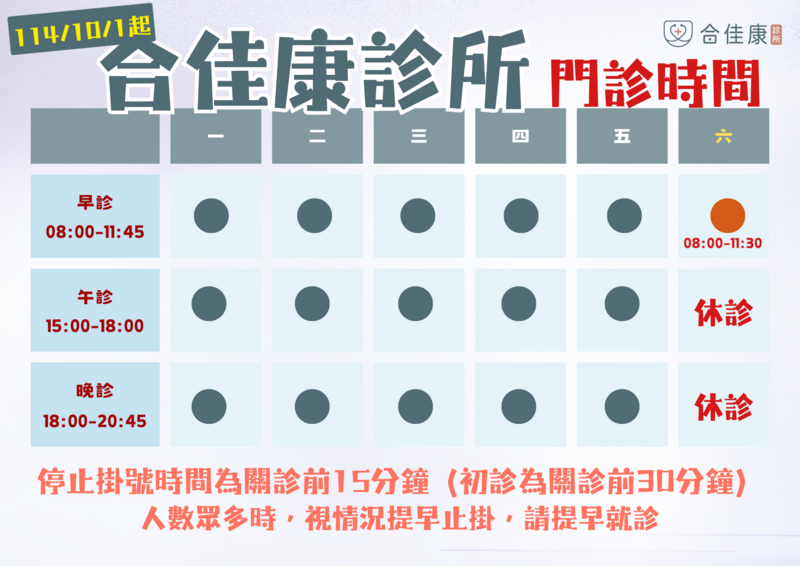診所採先到先看,最晚掛號時間為關診前15分鐘,如人數眾多時會提早停止掛號,請提早就診,謝謝。