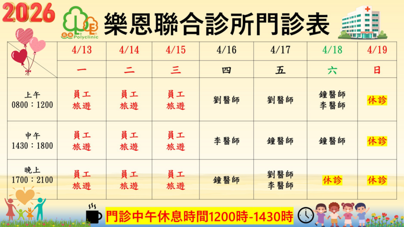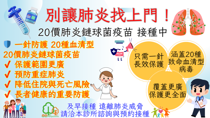 ★樂恩聯合診所衛教公告★📢預防腸病毒重症威脅,正確勤洗手& 接種腸病毒71型疫苗,一起守護您的寶貝健康╰(*°▽°*)╯❤️樂恩聯合診所關心您❤️ ★樂恩聯合診所衛教公告★📢預防肺炎黴漿菌感染123守則~(1)勤洗手、戴口罩(2)減少出入公共場所並保持社交距離(3)適當運動與均衡飲食增強免疫力 ❤️樂恩聯合診所關心您❤️ 🏥樂恩衛教快訊推播 📢好消息!衛生福利部國健署為提升兒童醫療照護,自113年7月1日起提供免費『兒童發展篩檢服務』,具健保身分之未滿7歲兒童,家長可依篩檢服務補助時程,至本院接受兒童發展篩檢服務~詳情歡迎向樂恩聯合診所門診護理師諮詢~❤️樂恩聯合診所關心您❤️ 🏥 樂恩衛教快訊📢面對肺炎鏈球菌病毒威脅~健康保衛戰首選 『20價肺炎鏈球菌疫苗是您最好的選擇』👍 🩺樂恩衛教快訊推播📢三價防護,一針安心~保護自己,也保護家人,接種流感疫苗最安心!本院即日起開放三價自費流感疫苗預約~💉疫苗諮詢專線☎️06-6331666~樂恩聯合診所關心您❤️❤️❤️ 好消息!好消息!本院猛健樂多劑量注射筆到院囉~想了解關於猛健樂更多衛教資訊,歡迎來電樂恩門診櫃台06-6331666諮詢,樂恩聯合診所關心您❤️❤️❤️