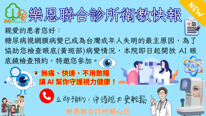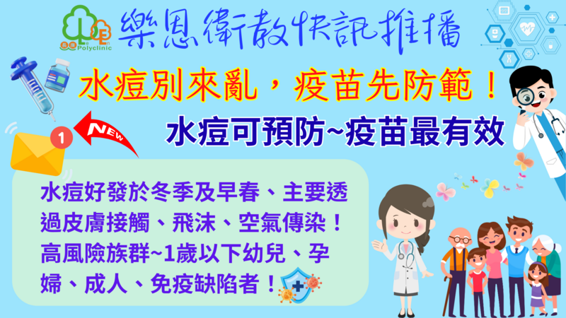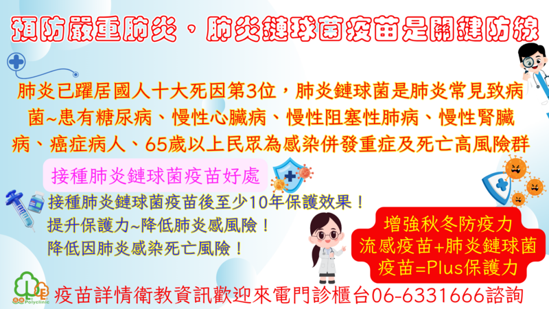 ★樂恩聯合診所衛教公告★📢預防腸病毒重症威脅,正確勤洗手& 接種腸病毒71型疫苗,一起守護您的寶貝健康╰(*°▽°*)╯❤️樂恩聯合診所關心您❤️ ★樂恩聯合診所衛教公告★📢預防肺炎黴漿菌感染123守則~(1)勤洗手、戴口罩(2)減少出入公共場所並保持社交距離(3)適當運動與均衡飲食增強免疫力 ❤️樂恩聯合診所關心您❤️ 🏥樂恩衛教快訊推播 📢好消息!衛生福利部國健署為提升兒童醫療照護,自113年7月1日起提供免費『兒童發展篩檢服務』,具健保身分之未滿7歲兒童,家長可依篩檢服務補助時程,至本院接受兒童發展篩檢服務~詳情歡迎向樂恩聯合診所門診護理師諮詢~❤️樂恩聯合診所關心您❤️ 🏥 樂恩衛教快訊📢面對肺炎鏈球菌病毒威脅~健康保衛戰首選 『15價肺炎鏈球菌疫苗是您最好的選擇』👍 🩺樂恩衛教快訊推播📢三價防護,一針安心~保護自己,也保護家人,接種流感疫苗最安心!本院即日起開放三價自費流感疫苗預約~💉疫苗諮詢專線☎️06-6331666~樂恩聯合診所關心您❤️❤️❤️ 樂恩聯合診所衛教快訊🩺預防流感~疫苗護航💉本院114年(東洋細胞型、賽諾菲、葛蘭素)自費流感疫苗全數到貨囉~早接種、早安心~樂恩陪您一起守護最愛的家人~自費流感疫苗諮詢專線06-6331666~樂恩聯合診所關心您❤️❤️❤️ 🏥樂恩衛教快訊推播📢流感季節來臨,保護心愛家人健康不能等最新鼻噴式流感疫苗是針對2歲以上孩童接種疫苗溫和新選擇~💉鼻噴式流感疫苗詳情衛教資訊歡迎來電門診櫃台06-6331666諮詢,樂恩聯合診所關心您❤️❤️❤️ 好消息!好消息!本院猛健樂多劑量注射筆到院囉~想了解關於猛健樂更多衛教資訊,歡迎來電樂恩門診櫃台06-6331666諮詢,樂恩聯合診所關心您❤️❤️❤️