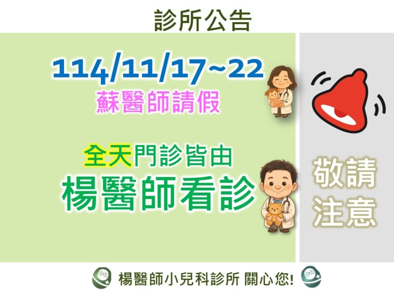 ❗❗公告❗❗ 11/17-22蘇醫師請假.全日門診由楊醫師看診 & 10/1起,公費及自費流感開打了,歡迎來電洽詢 &,楊醫師小兒科診所 關心您!🥰🥰🥰🥰🥰