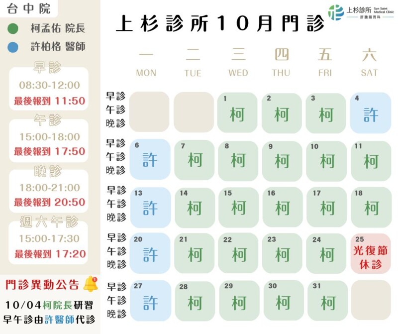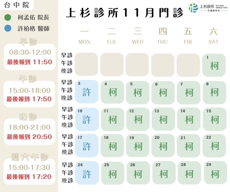 門診表: (預約 或是 現場掛號 *關診前30分鐘 請先前來報到*)