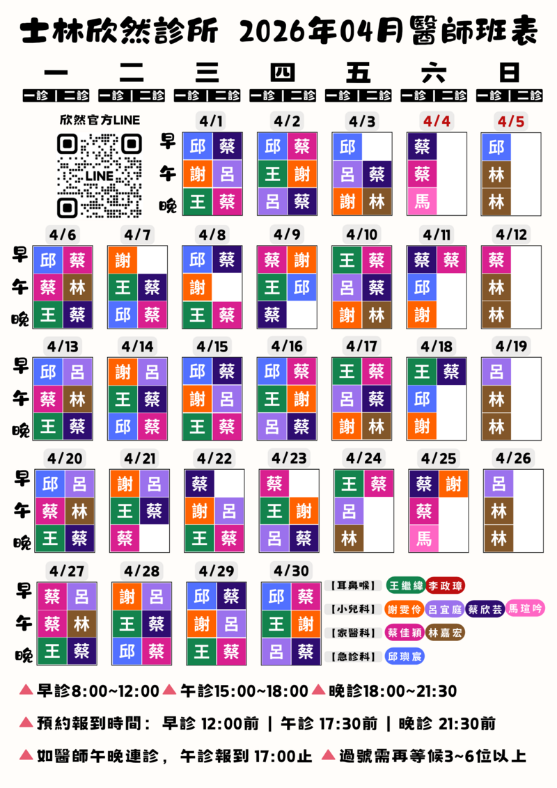 當診掛號時間 (預約候診請於時間內至櫃台完成報到):