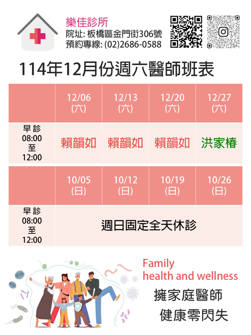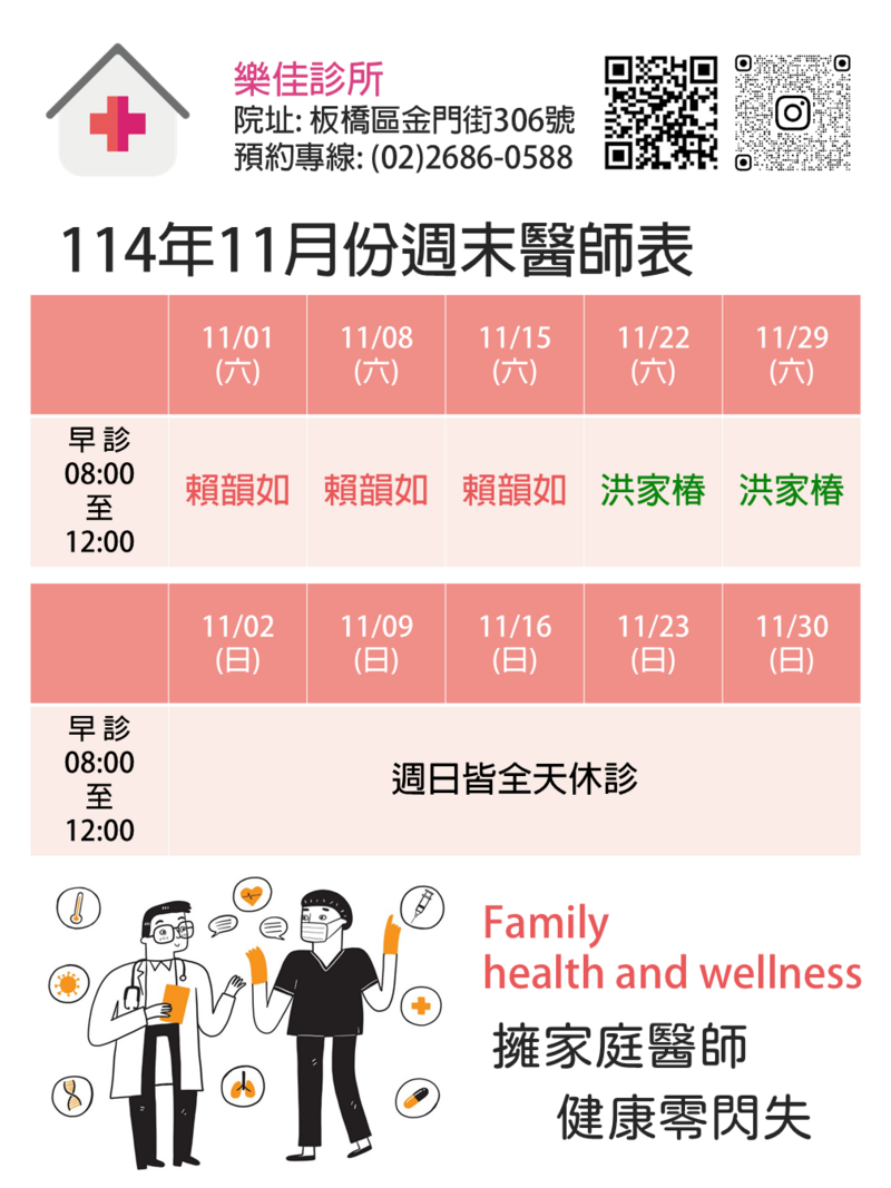 🌞 週一至週六早上8點準時開診 台大、馬偕與振興醫師團隊提供常見疾病的療治 守護您與家中幼童或年長者的健康 ⏰ 空腹8小時隨時可至本院抽血追蹤三高數值 開立3個月連續處方箋並優先採原廠藥品比照醫學中心 👒 同性女醫師秉持同理心溫柔照護私密處不適 如: 感染搔癢、異味分泌物、男女泌尿道炎、陰道炎、子宮頸抹片與乳房相關問題 🧸 樂佳診所提供HPV九價疫苗與欣剋疹/Shingrix(皮蛇)疫苗的諮詢與接種照護 🔎 先進超音波設備提供肝炎與子宮肌瘤相關追蹤 🏅 最新113年糖尿病照護各項指標成效 樂佳診所都優於板橋區與全國指標值