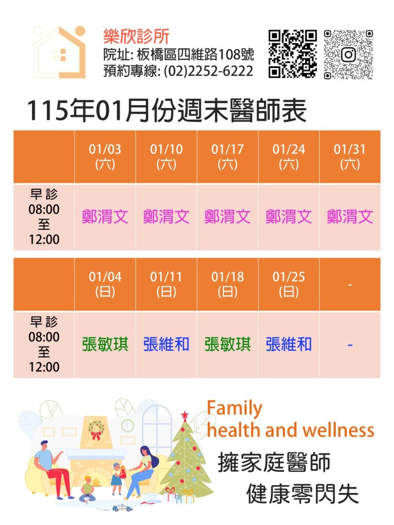 🌞 週一至週日每天早上8點準時開診 台大、馬偕與長庚醫師團隊提供常見疾病的治療 守護您與家中幼童或年長者的健康 ⏰ 空腹8小時隨時可至本院抽血追蹤三高數值 全院醫師皆擁「糖尿病共同照護網」認證 開立3個月連續處方箋並優先採原廠藥品比照醫學中心 💃 同性女醫師持同理心溫柔照護私密處不適 如:感染搔癢、異味分泌物、男女尿道炎、陰道炎、子宮頸抹片與乳房相關問題 💉 樂欣診所提供HPV九價疫苗與欣剋疹/Shingrix(皮蛇)疫苗的諮詢與接種照護 🥇 獲頒最新2024「糖尿病保腎護心卓越機構」認證 感謝台灣基層糖尿病協會 肯定本院對糖友腎臟與心臟健康的努力與貢獻 🥇 最新113年糖尿病照護各項指標成效 樂欣診所皆優於板橋區與全國指標值