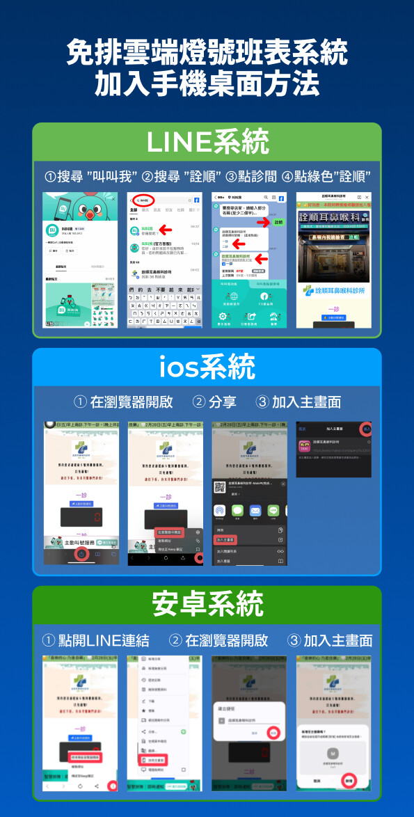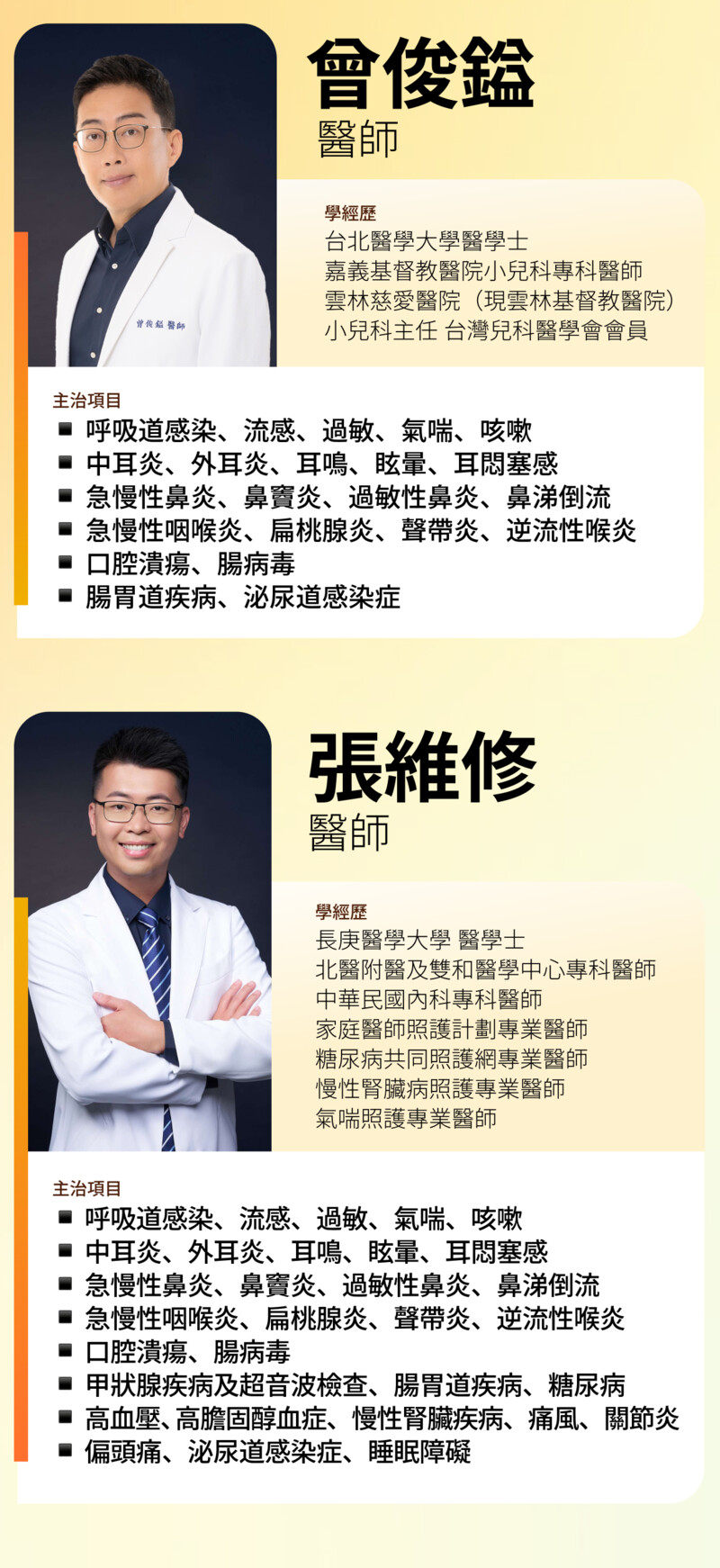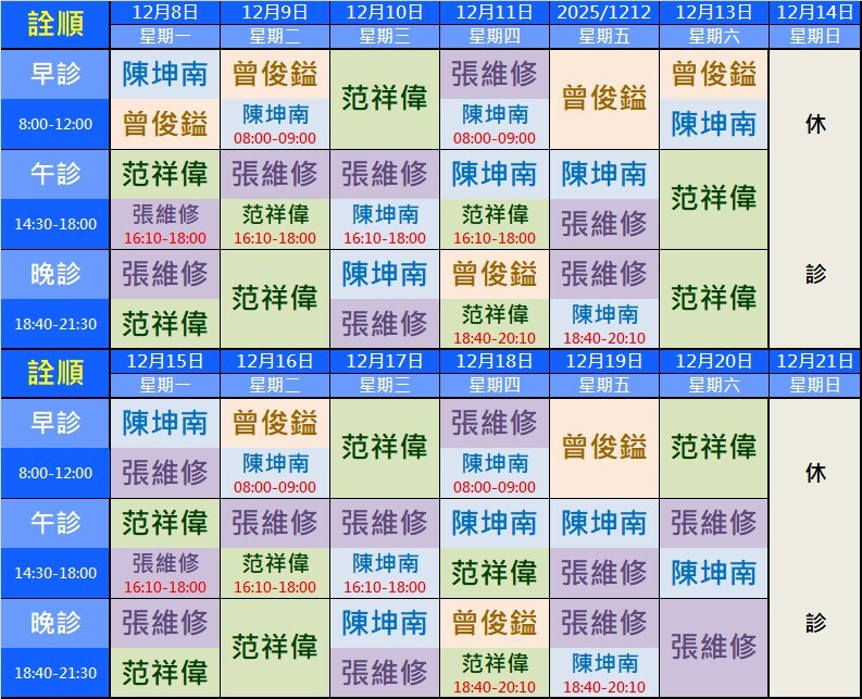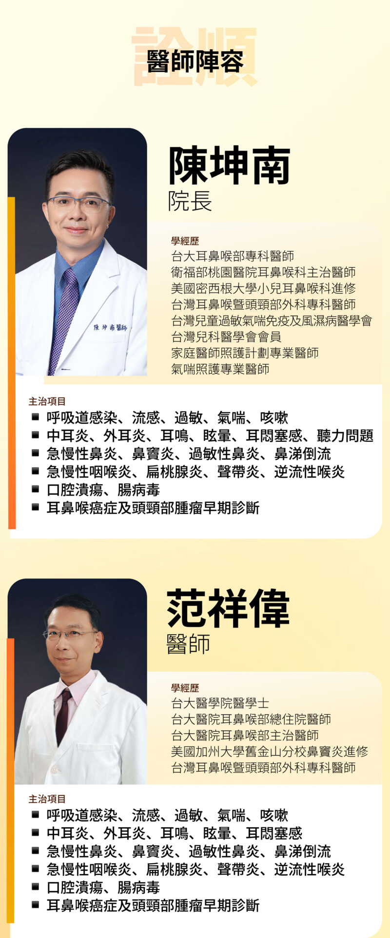 😊🤗😇😀😃喜樂的心,乃是良藥!😊🤗😇😀😃 👍好消息,本院特聘張維修醫師加入服務陣容,自十月份開始看診。詳見下方醫師介紹。👍 😎冬天生病患者較多,本院加開黃昏門診,以減少您等候時間。紅字標註時段無法網路預約,請電話預約或現場掛號。😎 😀本院自費流感疫已全數施打完畢無存貨。😀 👉LINE搜尋 ""叫叫我"" ,進入後搜尋 ""詮順"",點選一診或二診,再點選綠色 "詮順耳鼻喉科診所"" 即可進入本頁。👈