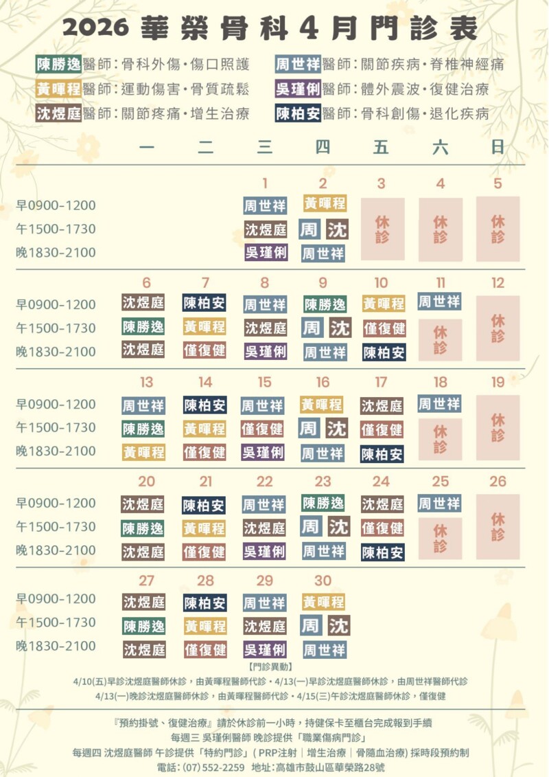 👨⚕️華榮診所公告🩺預約門診最晚報到時間請於當診休診前一小時報到,逾時者不保留預約,感謝配合🙂 ☎️(07)5522259🩺 👨⚕️增生治療│震波治療│PRP注射 非手術解決疼痛👨⚕️🩺