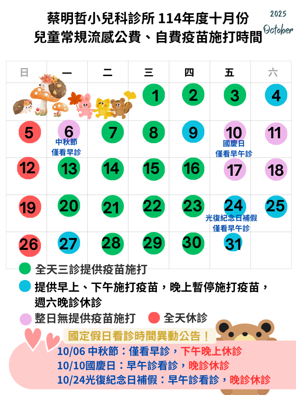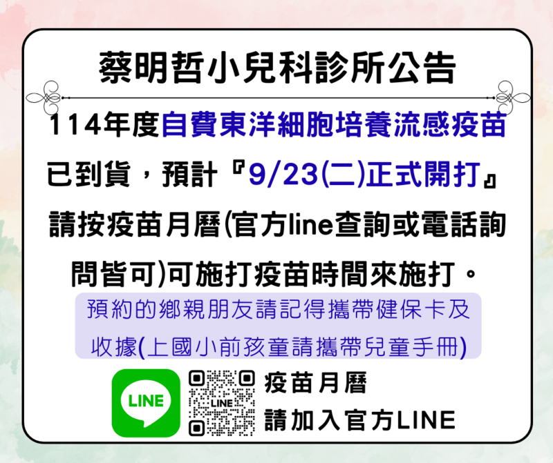 ✨自費東洋細胞培養流感疫苗熱烈施打中!✨114年公費流感疫苗『第一階段對象』10/01開打中!!✨電話預約請撥04-23338728✨現場掛號如遇預約人數較多需等候,可多加利用看診進度查詢,快到前6號請至現場等候,若遇過號人數較多需等候敬請見諒🙏 ✨預約掛號請提前6號報到並量體溫繳交健保卡才算完成報到。‼️若報到時已過號請看下方排序規則‼️ ⚠️有預約請注意最晚報到時間(請下拉網頁看時間表格),超過時間將自動取消預約。✅加官方LINE內建看診進度查詢。 ✅施打兒童常規疫苗請於有施打疫苗的診次(下拉網頁有疫苗月曆),並攜帶兒童手冊及健保卡報到,若需電話預約請告知要施打疫苗。