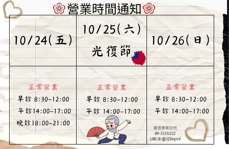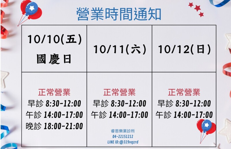 睿恩樂業診所 週六、日皆有醫師看診 歡迎入內看診~~ 一樓:本院提供全方位專業醫療服務,服務內容包含耳鼻喉、 頭頸、兒科方面、皮膚疾病、減重、除痣、客製化鼻塞及打鼾無線射頻術式手術的醫療諮詢及服務 二樓:睿恩樂業診所附設-緻優醫學美容中心,服務療程有:皮秒雷射-淨膚/除斑/除刺青/皮秒蜂巢、除毛系列、肉毒、玻尿酸、客製化營養點滴、醫美美療-粉刺調理、水嫩保濕、杏仁酸(痘痘調理) 歡迎您入店,我們有專業醫美醫師及美容師為您個人諮詢及服務 ***本院有 HPV 九價疫苗、帶狀皰疹【欣克疹】疫苗施打、還有Threads討論度很高的「猛健樂」瘦瘦針、「善纖達」瘦瘦針及減重同時可搭配代謝加速的客制化「消脂點滴」讓您減重沒煩惱 醫美活動:歡慶10月活動及隱藏版限定活動、10月連休三天系列活動、節慶(婚宴)禮盒,歡迎立即預約醫美