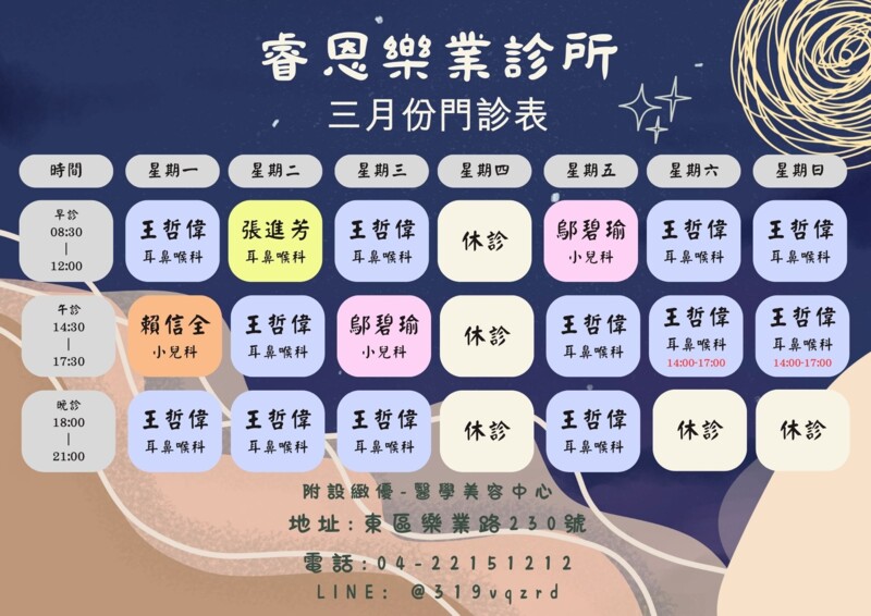 睿恩樂業診所 週六、日皆有醫師看診 歡迎入內看診~~ 一樓:本院提供全方位專業醫療服務,服務內容包含耳鼻喉、 頭頸、兒科方面、皮膚疾病、減重、除痣、客製化鼻塞及打鼾無線射頻術式手術的醫療諮詢及服務 二樓:睿恩樂業診所附設-緻優醫學美容中心,服務療程有:皮秒雷射-淨膚/除斑/除刺青/皮秒蜂巢、除毛系列、肉毒、玻尿酸、客製化營養點滴、醫美美療-粉刺調理、水嫩保濕、杏仁酸(痘痘調理) 歡迎您入店,我們有專業醫美醫師及美容師為您個人諮詢及服務 ***本院有 HPV 九價疫苗、帶狀皰疹【欣克疹】疫苗施打、還有Threads討論度很高的「猛健樂」瘦瘦針、「善纖達」瘦瘦針及減重 讓您減重沒煩惱 ; 節慶(婚宴)禮盒,歡迎立即預約醫美!