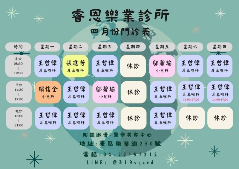 睿恩樂業診所 週六、日皆有醫師看診 歡迎入內看診~~ 一樓:本院提供全方位專業醫療服務,服務內容包含耳鼻喉、 頭頸、兒科方面、皮膚疾病、減重、除痣、客製化鼻塞及打鼾無線射頻術式手術的醫療諮詢及服務 二樓:睿恩樂業診所附設-緻優醫學美容中心,服務療程有:皮秒雷射-淨膚/除斑/除刺青/皮秒蜂巢、除毛系列、肉毒、玻尿酸、客製化營養點滴、醫美美療-粉刺調理、水嫩保濕、杏仁酸(痘痘調理) 歡迎您入店,我們有專業醫美醫師及美容師為您個人諮詢及服務 ***本院有 HPV 九價疫苗、帶狀皰疹【欣克疹】疫苗施打、還有Threads討論度很高的「猛健樂」瘦瘦針及減重諮詢 讓您減重沒煩惱 ; 節慶(婚宴)禮盒,歡迎立即預約醫美!