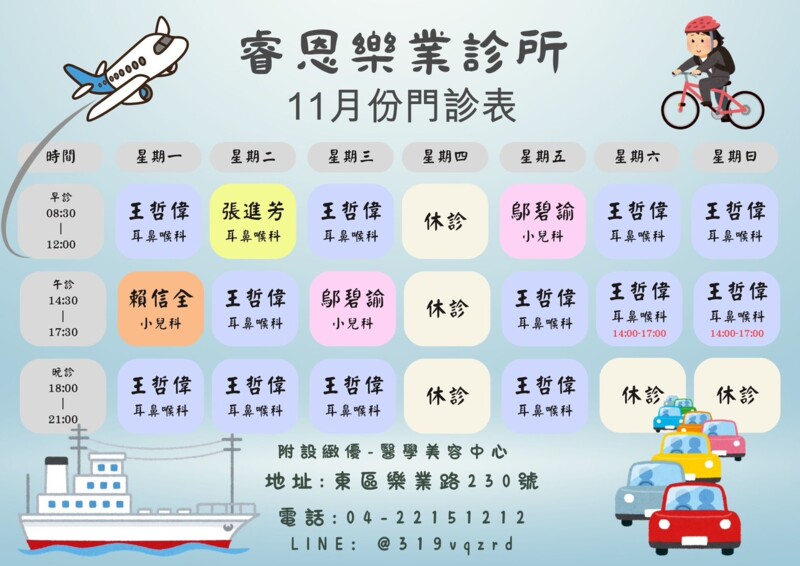 睿恩樂業診所 週六、日皆有醫師看診 歡迎入內看診~~ 一樓:本院提供全方位專業醫療服務,服務內容包含耳鼻喉、 頭頸、兒科方面、皮膚疾病、減重、除痣、客製化鼻塞及打鼾無線射頻術式手術的醫療諮詢及服務 二樓:睿恩樂業診所附設-緻優醫學美容中心,服務療程有:皮秒雷射-淨膚/除斑/除刺青/皮秒蜂巢、除毛系列、肉毒、玻尿酸、客製化營養點滴、醫美美療-粉刺調理、水嫩保濕、杏仁酸(痘痘調理) 歡迎您入店,我們有專業醫美醫師及美容師為您個人諮詢及服務 ***本院有 HPV 九價疫苗、帶狀皰疹【欣克疹】疫苗施打、還有Threads討論度很高的「猛健樂」瘦瘦針、「善纖達」瘦瘦針及減重 讓您減重沒煩惱 醫美活動:節慶(婚宴)禮盒,歡迎立即預約醫美