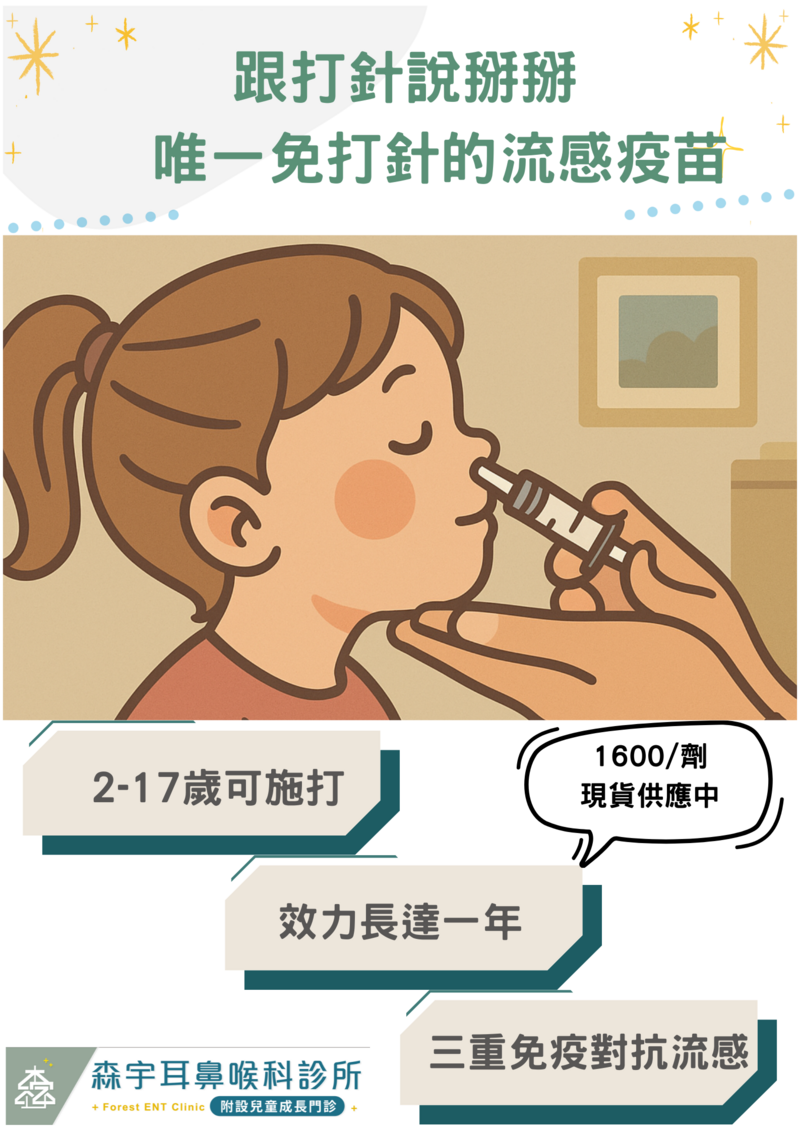 本院目前提供公費流感疫苗、自費東洋細胞培養疫苗和自費鼻噴式流感疫苗!! 過敏性鼻炎的病友看過來, 本院引進最新鼻噴劑!!!