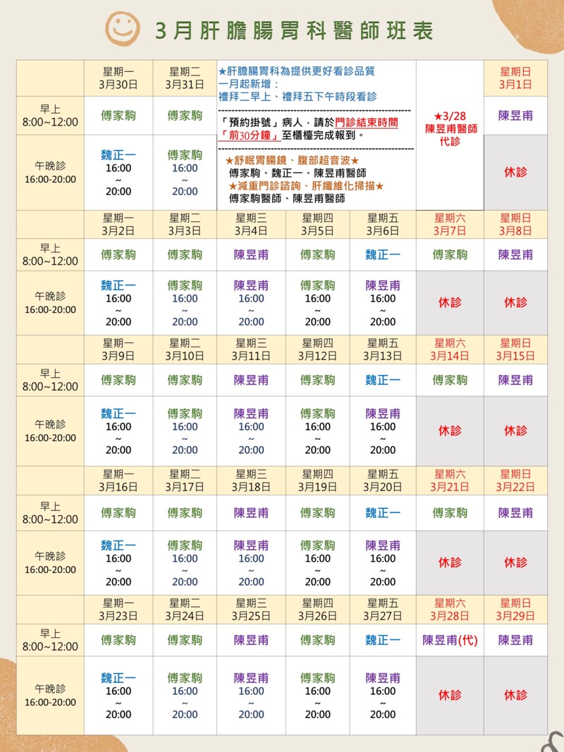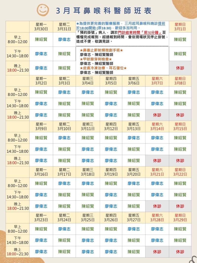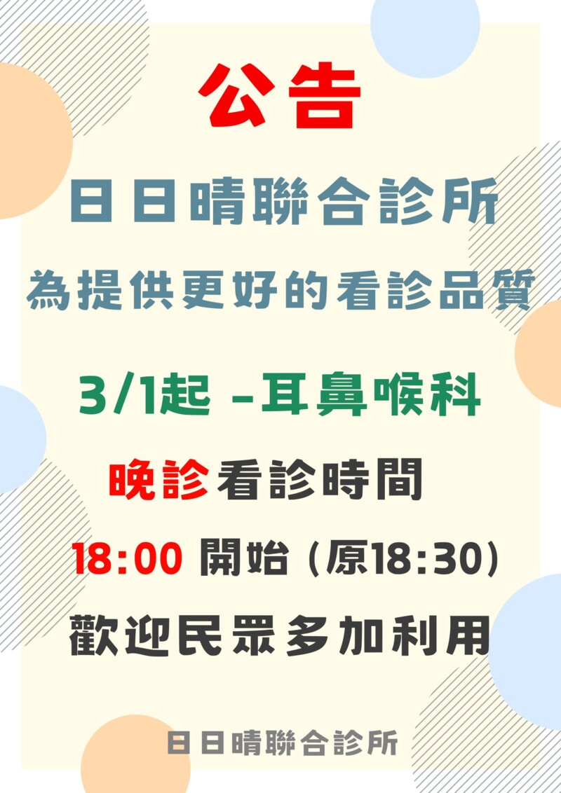 😷 甲狀腺及頸部超音波特別門診 😖 耳鳴及聽力特別門診 😵 暈眩及耳石復位治療 ⭐客製健檢推廣中,歡迎洽詢櫃台 ⭐舒眠腸胃鏡檢 ⭐三高慢性疾病追蹤 ⭐肝炎檢查 ⭐超音波 ⭐本院有提供帶狀皰疹疫苗、9HPV疫苗、15價肺炎鏈球菌疫苗 歡迎洽詢