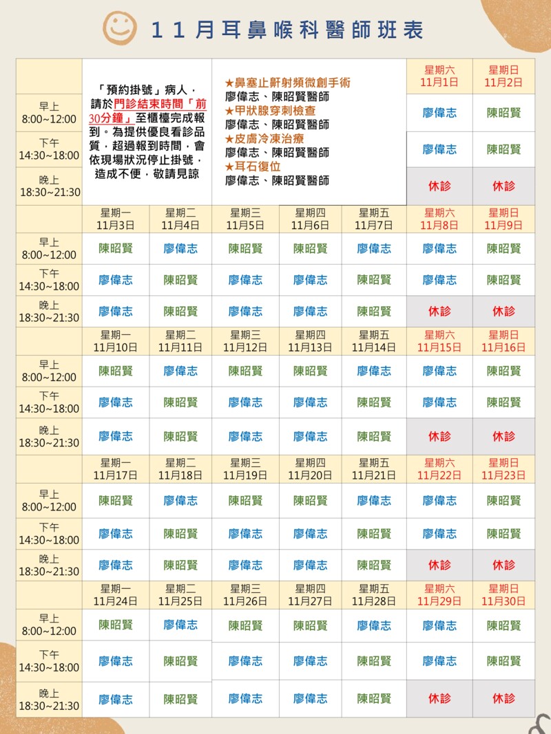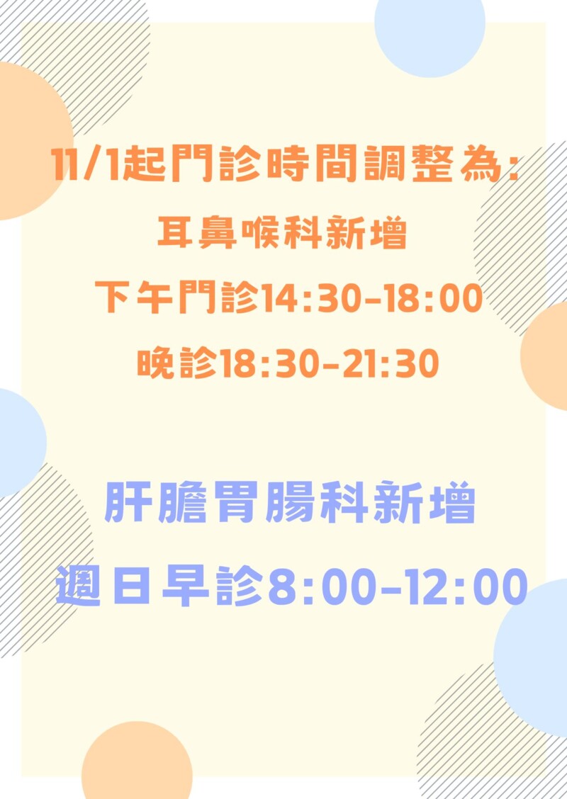 😷 甲狀腺及頸部超音波特別門診 😖 耳鳴及聽力特別門診 😵 暈眩及耳石復位治療 ⭐客製健檢推廣中,歡迎洽詢櫃台 ⭐舒眠腸胃鏡檢 ⭐三高慢性疾病追蹤 ⭐肝炎檢查 ⭐超音波 ⭐本院有提供帶狀皰疹疫苗、9HPV疫苗、13價肺炎鏈球菌疫苗 歡迎洽詢