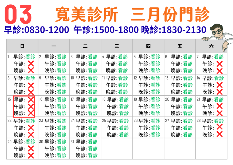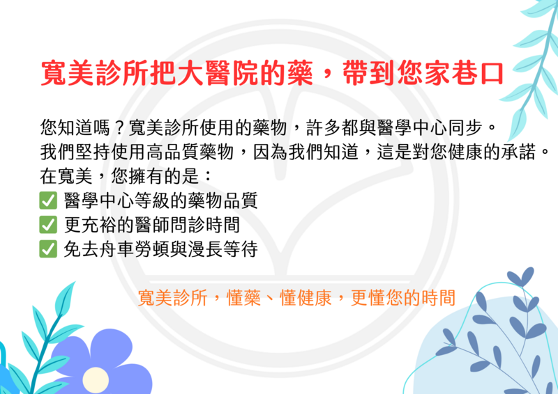 寬心守護 美好健康 ,全民健康保險特約診所,看診時間禮拜一至五:早上0830-1200,下午(1500-1800),晚上(1830-2130),六、日早上皆有看診 診所備有流感快篩及抗病毒藥物 瘦瘦針已到貨!!!!