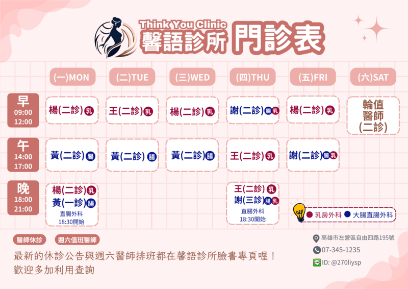 休診公告請關注【馨語診所】官方臉書帳號 門診前半小時截止掛號 本院所提供乳房超音波檢查、微創手術;大腸直腸科檢查、腸胃鏡檢查、微創痔瘡 歡迎加官方賴 @270liysp 詢問