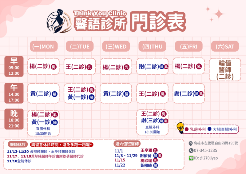 休診公告請關注【馨語診所】官方臉書帳號 門診前半小時截止掛號 本院所提供乳房超音波檢查、微創手術;大腸直腸科檢查、腸胃鏡檢查、微創痔瘡 歡迎加官方賴 @270lipsy詢問