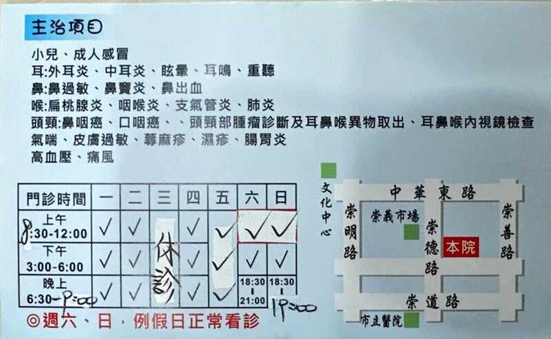 週三休診 上午8:30-12:00 下午 15:00-18:00 晚上 18:30-21:00 原廠藥 內視鏡檢查 流感篩檢 公費流感及13價23價肺炎球菌疫苗 自費帶狀疱疹疫苗