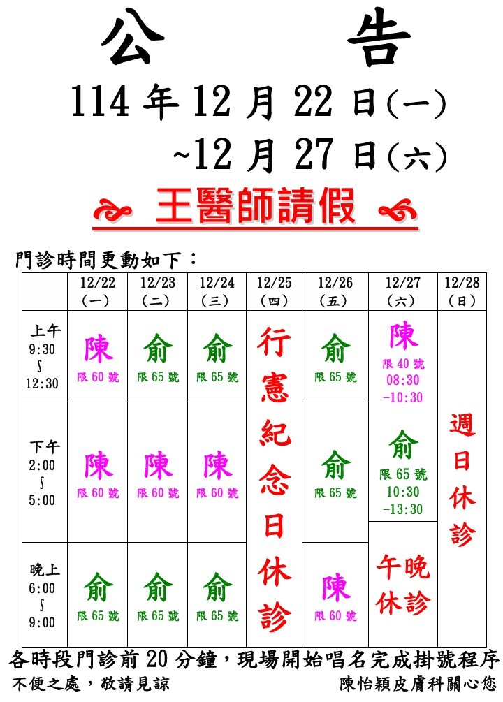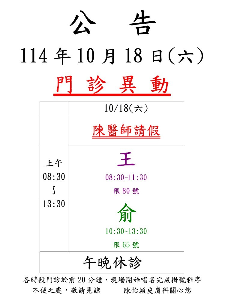 為維護看診品質,每診均有名額限制,初診須現場掛號,複診可提前預約(當天恕不接受預約),歡迎您於門診時間來電洽詢,感謝您的支持與愛護!