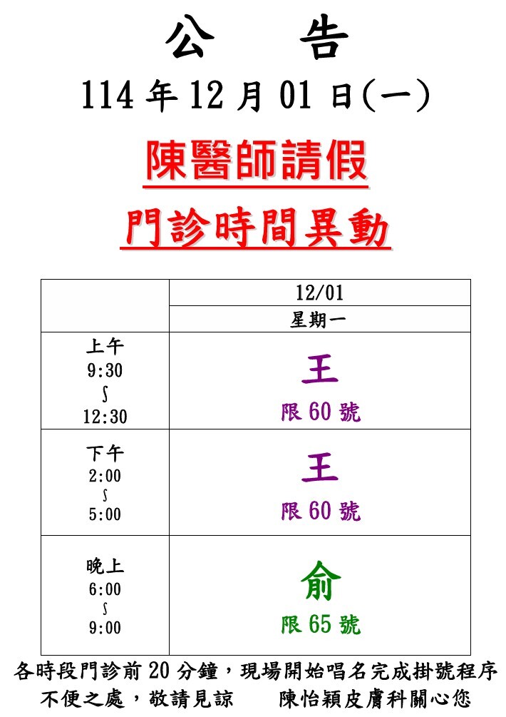 陳8:30~10:00 王8:30~11:30 俞10:30~13:30 |