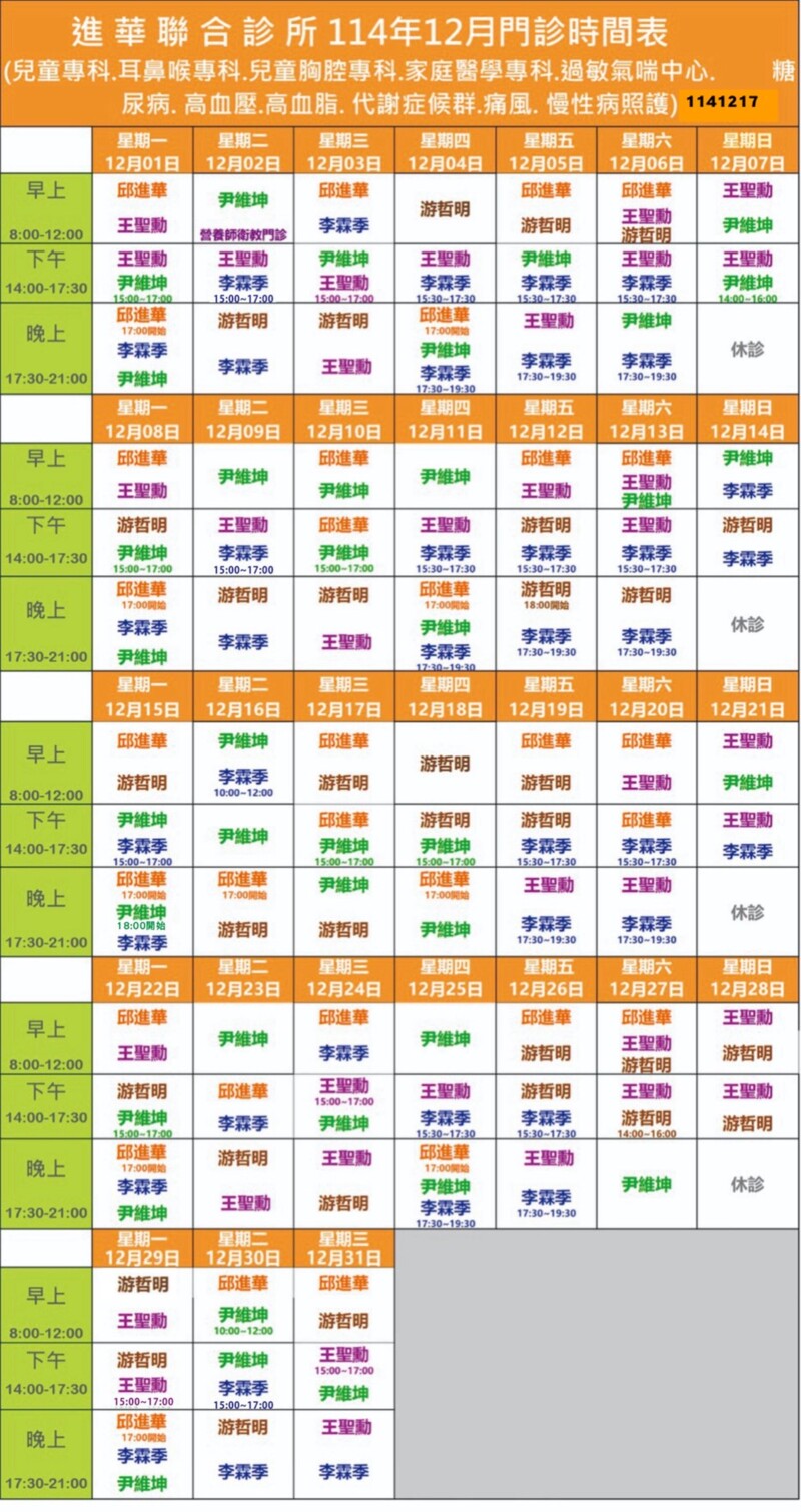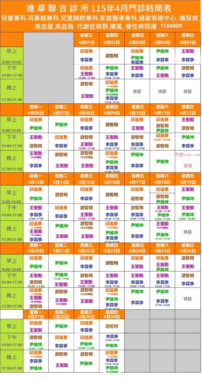 FB粉絲團 : 進華聯合診所 (FB每月更新門診表)