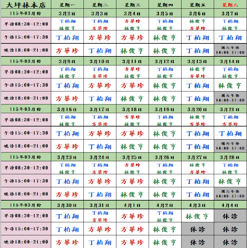 【本店門診表每月會更新請往下查看】