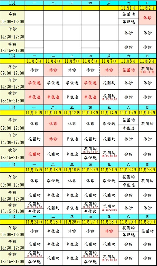 10月起門診表
