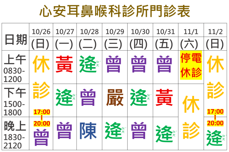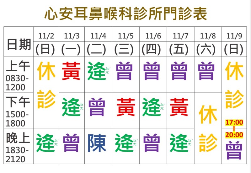 停診ㄧ次;11/2(日)正常看診17:00-20:00