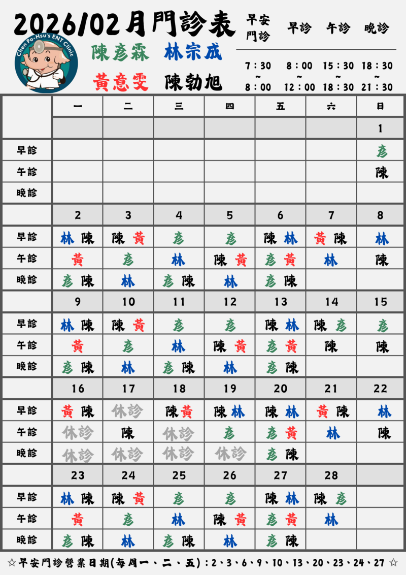 2月份每週五午診改為 陳彥霖、黃意雯醫師