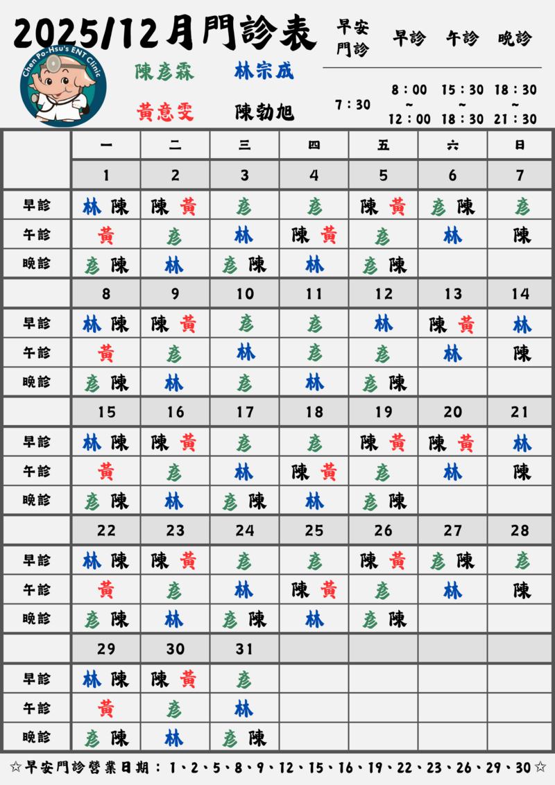 12/10~12/12(早診) 陳勃旭醫師、黃意雯醫師 請假