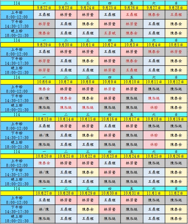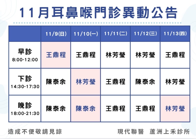 耳鼻喉科門診表 ( 週日有門診服務 )