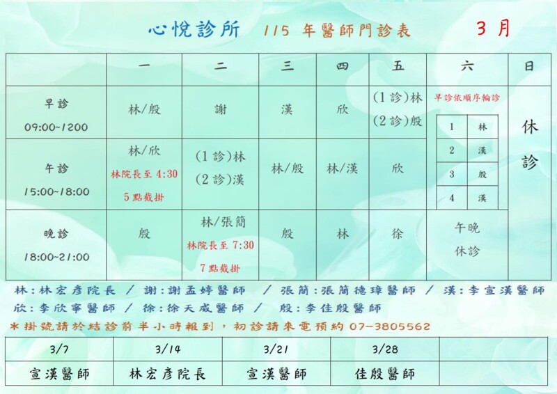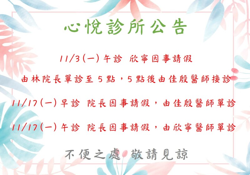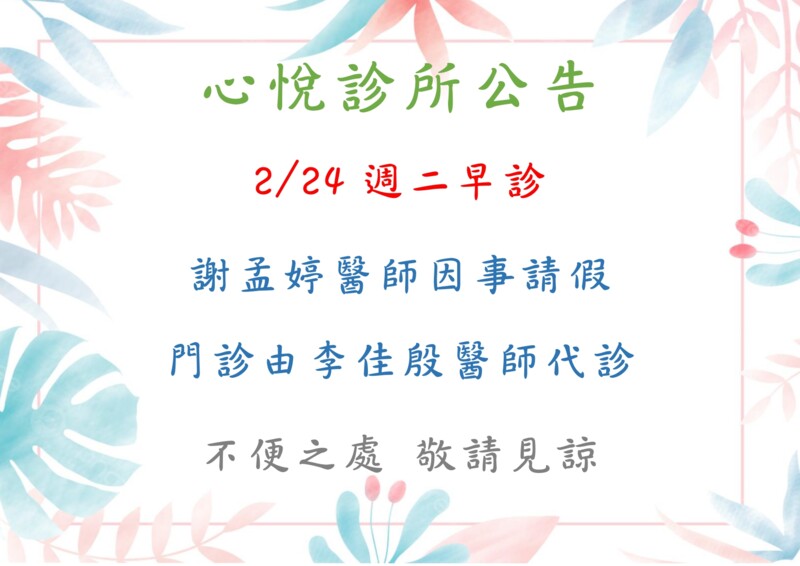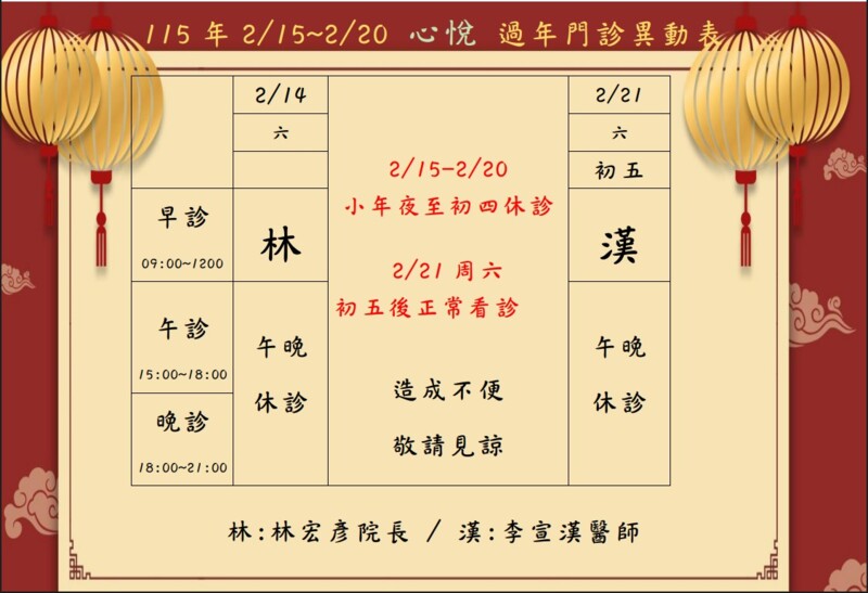 因應疫情鬆綁政策,即日起已無提供視訊看診服務,回歸實體看診