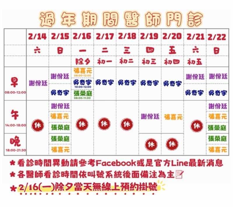 早上08:00-12:00下午14:00-18:00晚上18:00-21:30*當診掛號前10分鐘可將健保卡放至掛號櫃台排隊
