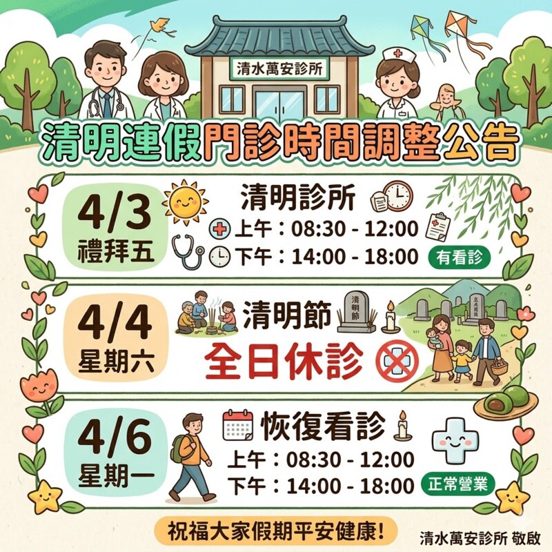 嘿!各位親愛的鄉親父老、大小朋友們注意啦!📢 清明連假準備要回鄉掃墓、全家出遊了嗎?🚗💨 出發前,記得先瞄一眼我們的連假開診時間,別白跑一趟唷!👀👇