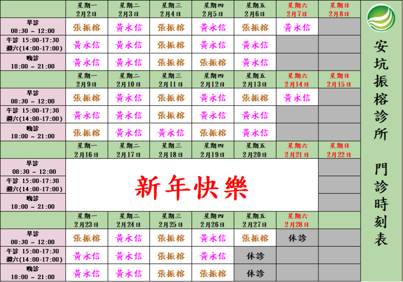 **115-02-09(W一)晚診改為張振榕醫師看診