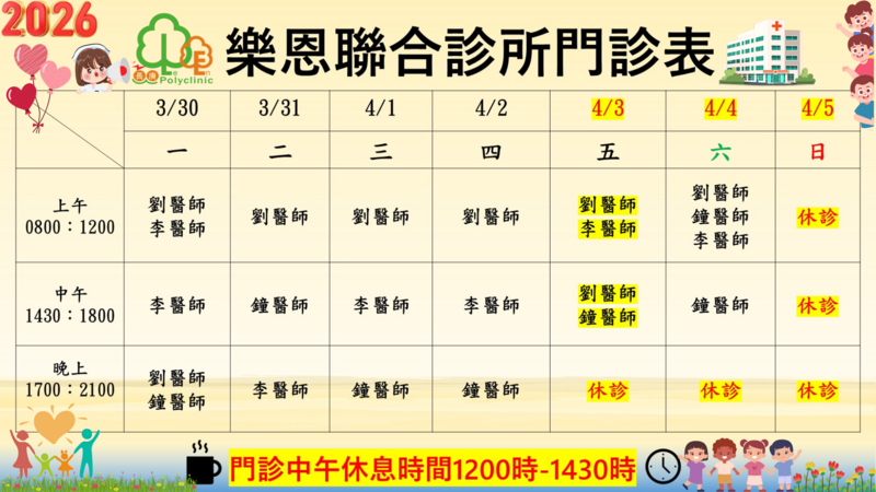 ★樂恩聯合診所衛教公告★📢預防腸病毒重症威脅,正確勤洗手& 接種腸病毒71型疫苗,一起守護您的寶貝健康╰(*°▽°*)╯❤️樂恩聯合診所關心您❤️ ★樂恩聯合診所衛教公告★📢預防肺炎黴漿菌感染123守則~(1)勤洗手、戴口罩(2)減少出入公共場所並保持社交距離(3)適當運動與均衡飲食增強免疫力 ❤️樂恩聯合診所關心您❤️ 🏥樂恩衛教快訊推播 📢好消息!衛生福利部國健署為提升兒童醫療照護,自113年7月1日起提供免費『兒童發展篩檢服務』,具健保身分之未滿7歲兒童,家長可依篩檢服務補助時程,至本院接受兒童發展篩檢服務~詳情歡迎向樂恩聯合診所門診護理師諮詢~❤️樂恩聯合診所關心您❤️ 🏥 樂恩衛教快訊📢面對肺炎鏈球菌病毒威脅~健康保衛戰首選 『20價肺炎鏈球菌疫苗是您最好的選擇』👍 🩺樂恩衛教快訊推播📢三價防護,一針安心~保護自己,也保護家人,接種流感疫苗最安心!本院即日起開放三價自費流感疫苗預約~💉疫苗諮詢專線☎️06-6331666~樂恩聯合診所關心您❤️❤️❤️ 好消息!好消息!本院猛健樂多劑量注射筆到院囉~想了解關於猛健樂更多衛教資訊,歡迎來電樂恩門診櫃台06-6331666諮詢,樂恩聯合診所關心您❤️❤️❤️