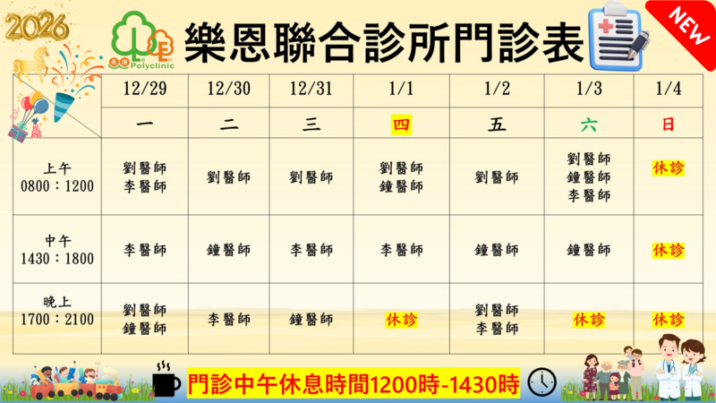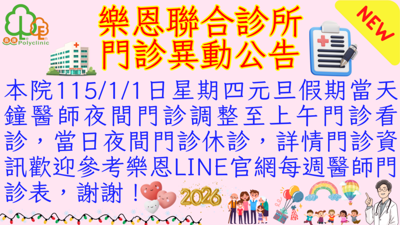 ★樂恩聯合診所衛教公告★📢預防腸病毒重症威脅,正確勤洗手& 接種腸病毒71型疫苗,一起守護您的寶貝健康╰(*°▽°*)╯❤️樂恩聯合診所關心您❤️ ★樂恩聯合診所衛教公告★📢預防肺炎黴漿菌感染123守則~(1)勤洗手、戴口罩(2)減少出入公共場所並保持社交距離(3)適當運動與均衡飲食增強免疫力 ❤️樂恩聯合診所關心您❤️ 🏥樂恩衛教快訊推播 📢好消息!衛生福利部國健署為提升兒童醫療照護,自113年7月1日起提供免費『兒童發展篩檢服務』,具健保身分之未滿7歲兒童,家長可依篩檢服務補助時程,至本院接受兒童發展篩檢服務~詳情歡迎向樂恩聯合診所門診護理師諮詢~❤️樂恩聯合診所關心您❤️ 🏥 樂恩衛教快訊📢面對肺炎鏈球菌病毒威脅~健康保衛戰首選 『15價肺炎鏈球菌疫苗是您最好的選擇』👍 🩺樂恩衛教快訊推播📢三價防護,一針安心~保護自己,也保護家人,接種流感疫苗最安心!本院即日起開放三價自費流感疫苗預約~💉疫苗諮詢專線☎️06-6331666~樂恩聯合診所關心您❤️❤️❤️ 🏥樂恩衛教快訊推播📢流感季節來臨,保護心愛家人健康不能等最新鼻噴式流感疫苗是針對2歲以上孩童接種疫苗溫和新選擇~💉鼻噴式流感疫苗詳情衛教資訊歡迎來電門診櫃台06-6331666諮詢,樂恩聯合診所關心您❤️❤️❤️ 好消息!好消息!本院猛健樂多劑量注射筆到院囉~想了解關於猛健樂更多衛教資訊,歡迎來電樂恩門診櫃台06-6331666諮詢,樂恩聯合診所關心您❤️❤️❤️ 樂恩聯合診所衛教快報🩺糖尿病視網膜病變已成為台灣成年人失明的最主原因,為了協助您檢查眼底(黃斑部)病變情況,本院即日起開放 AI 眼底鏡檢查預約,特邀您參加~詳情門診預約資訊歡迎來電樂恩聯合診所門診櫃台06-6331666諮詢~樂恩聯合診所關心您❤️❤️❤️ 🩺樂恩聯合診所115年元旦假期門診異動公告📢本院115/1/1日星期四元旦假期當天鐘醫師夜間門診調整至上午門診看診,當日夜間門診休診,詳情門診資訊歡迎參考樂恩LINE官網每週醫師門診表,謝謝!